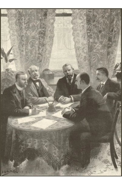 In fact, 1866-7 proved to be quite an eventful period for the hotel. In its conference chamber, negotiations aiming to complete the process of bringing the constituent parts of Canada into a single country had reached agreement in principle on Christmas Eve 1866. These had been led by Sir John Macdonald, joint premier of the province of Canada (Ontario & Quebec) – though Sir John had also delayed them as he left North America several months late, allegedly due to his heavy drinking. Perhaps the same thing led to a candle igniting a chair in his Westminster Palace Hotel bedroom one night. He was sitting in it at the time and was seriously burned, but this time the talks were not delayed. The British North America Act was passed, a short walk away in Parliament, in March 1867, and the Dominion of Canada came into existence in July that year. Macdonald became the Dominion’s first Prime Minister. A commemorative mural was put up in the conference chamber.